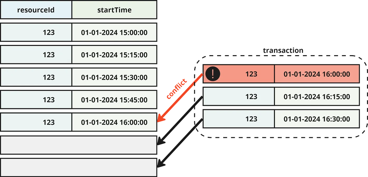 In the listing below, you can see how a table with an exclusion constraint can be created. The configuration possibilities are quite impressive. I ensured that the resourceId