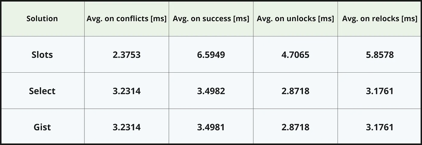 The SQLs for this solution are the easiest ones because we rely only on the GiST index with the exclusion, no jumble and no puzzles.