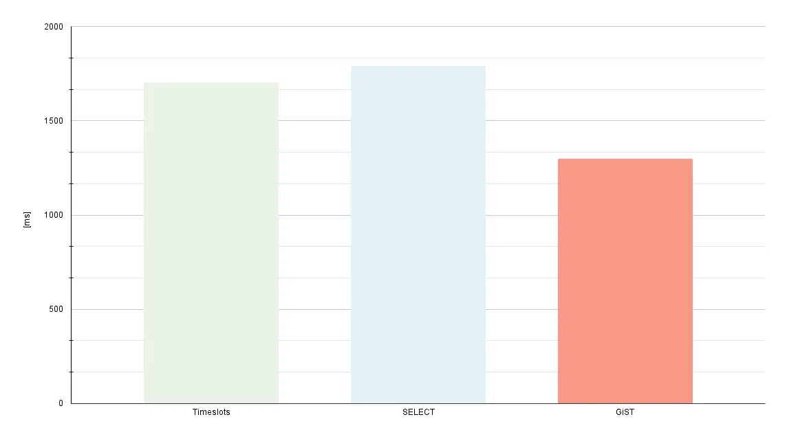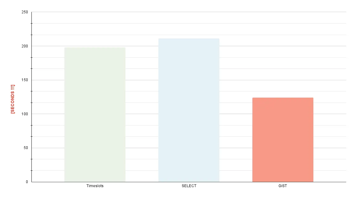 I bumped up the number of rows for the SELECT and GIST solutions to 120 million to make them more comparable to the first solution regarding the absolute number of tuples. But, again, the implementations don't diverge from each other.