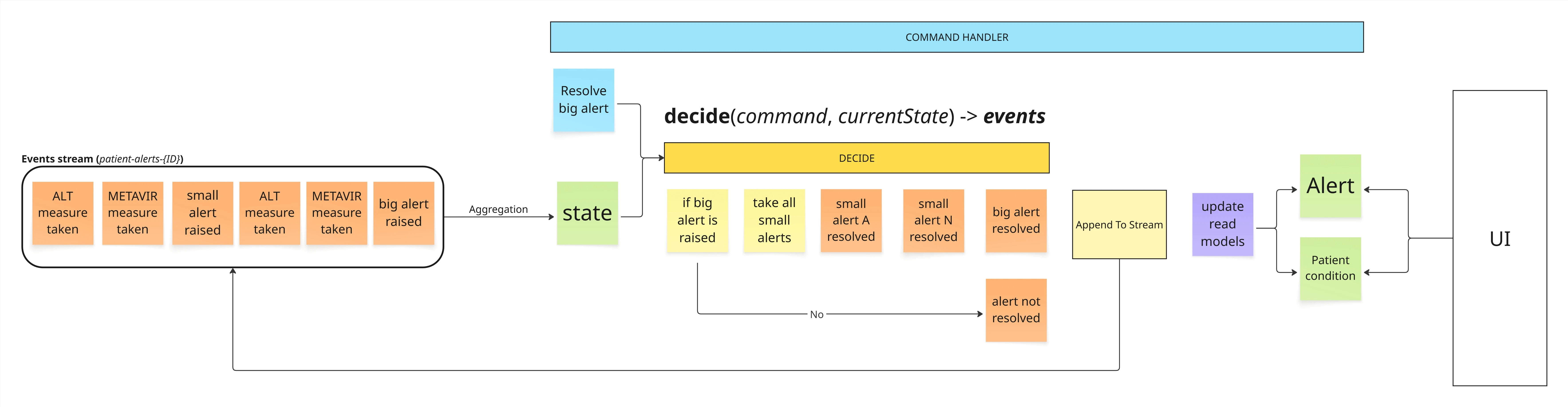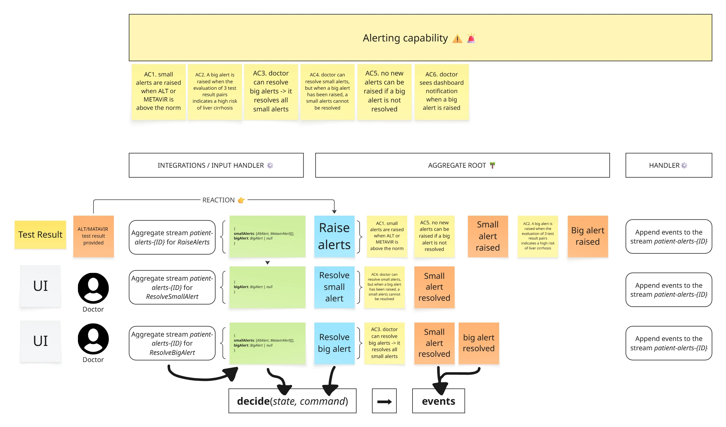 3️⃣ Having the current state and the command, we can DECIDE what to do. The invariants are that if there are unresolved small alerts, we shall resolve them and then resolve the big alert. That results in some events.