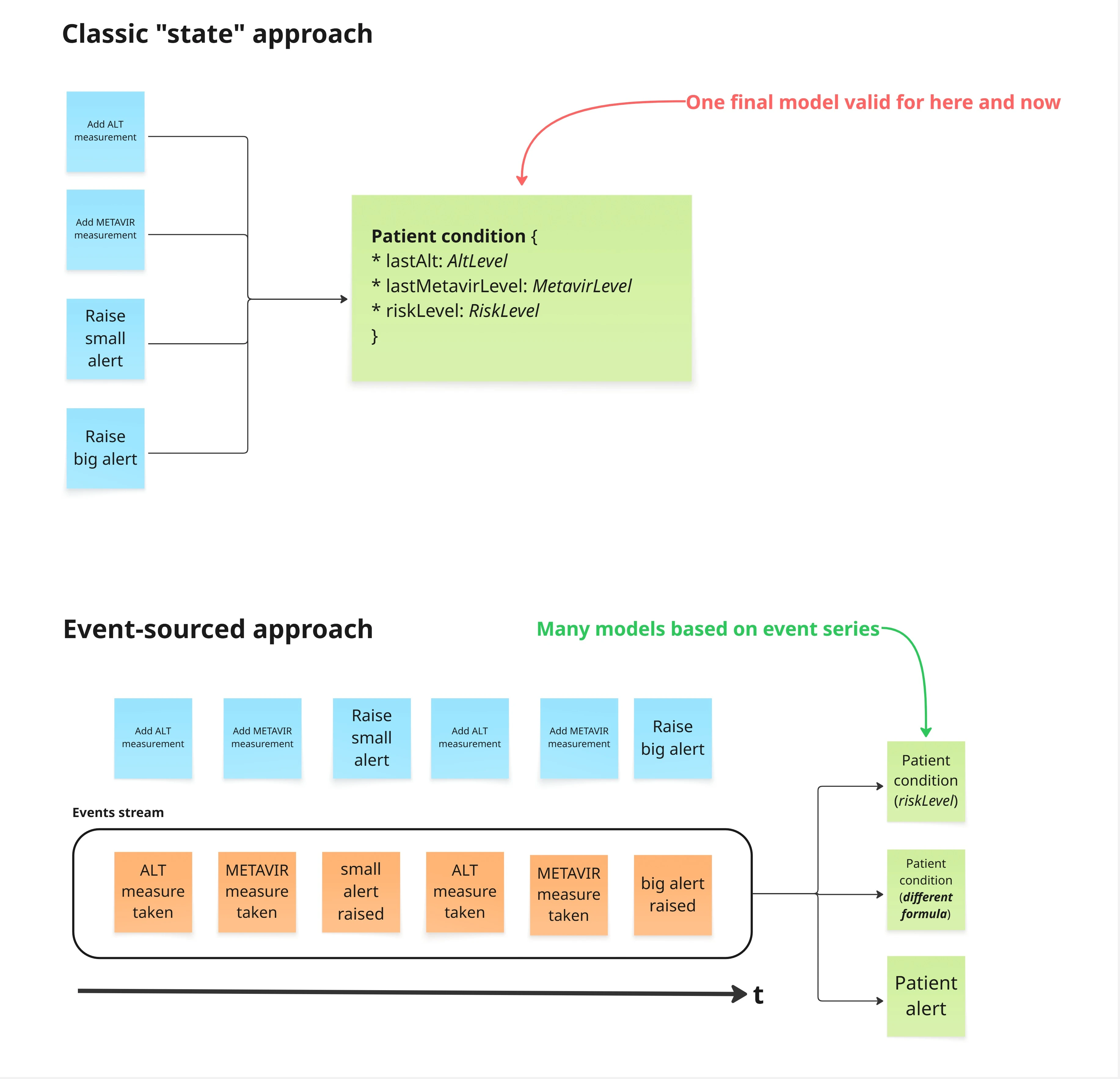 Image 1. Comparison of the fixed-state approach and the event-sourced one.