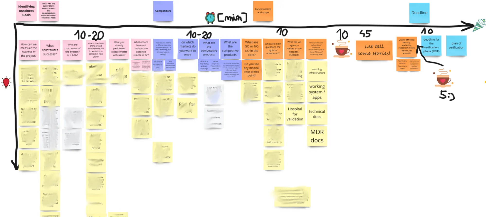 A simple workshop board with a timeline and categorized sets of questions